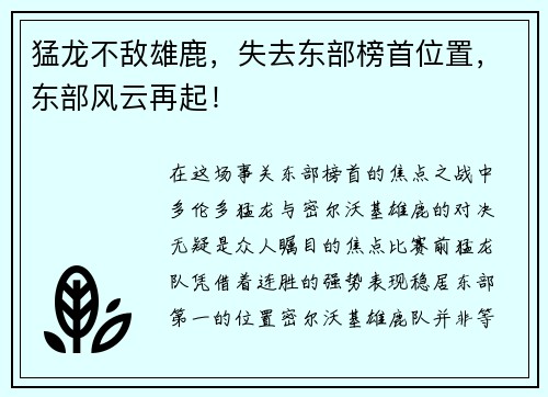猛龙不敌雄鹿,失去东部榜首位置,东部风云再起!