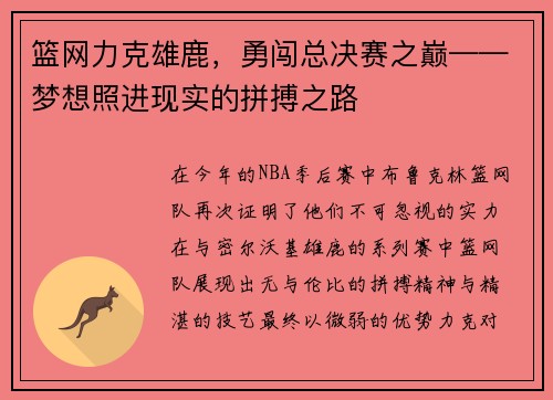 篮网力克雄鹿,勇闯总决赛之巅——梦想照进现实的拼搏之路