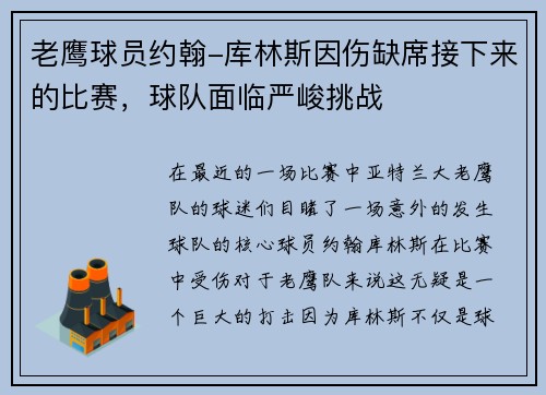 老鹰球员约翰-库林斯因伤缺席接下来的比赛,球队面临严峻挑战