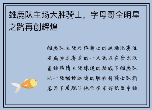 雄鹿队主场大胜骑士,字母哥全明星之路再创辉煌